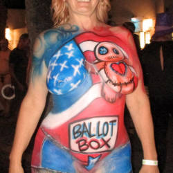 • Photo 3 was unfortunate. Hard to imagine people broad minded enough to be at Fantasyfest but gullible enough to go with that political shit. Any political painting is in poor taste at an event like this - we all like skin and nudity - we should be celebrating what we have in common, not spoiling a nice bodypainting with politics (of either side).